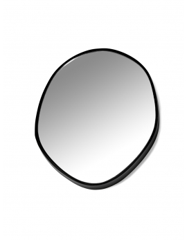 De speelse spiegeltjes van Marie Michielssen voor Serax zorgen met hun grote en kleine organische vormen, zwarte rand en reflectie van de rechte lijnen van de overige strakke objecten in de ruimte, zowel alleen als in groep, voor een verrassend visueel spel op elke muur.