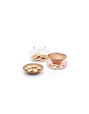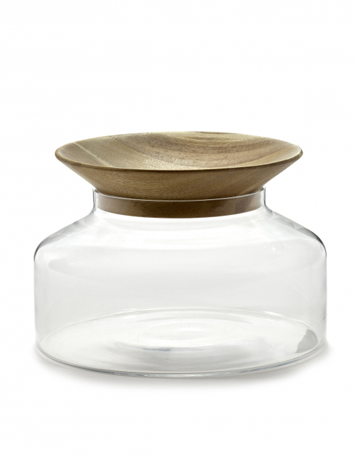 Keer op keer verrast Ontwerpduo met ontwerpen die onmiskenbare functionaliteit en schoonheid uitstralen. Dat is niet anders voor de glazen potten met bijpassende deksels van warm acaciahout. De deksels kunnen ook als borden of schalen worden gebruikt.