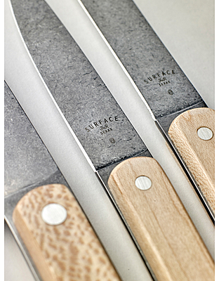 Een groot allround keukenmes, een kantoormes voor de delicater werk en een steakmes, met lemmeten van het sterkste staal en handgrepen van hoogwaardige kwaliteithout dat we gebruiken voor de snijplanken."