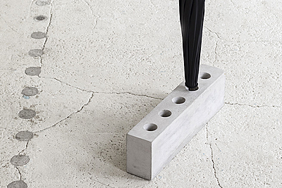 De paraplubak heeft dezelfde look & feel als ‘Frame’, het kledingrek dat De Limburg eerder voor Serax ontwierp. Met loodrechte, gaten onder een hoek van 30 graden, kantelen alle parasols in de standaard nu in dezelfde richting, alsof ze allemaal opzij worden ‘geblazen’ door een lichte bries.”