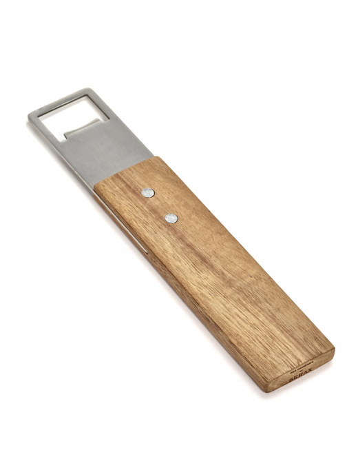 In het kenmerkende acaciahout en mat gepolijste roestvrij staal van de Bea Mombaers for Serax-lijn ontwierp de interieurstyliste een strakke flessenopener en bijpassende citroenschiller.