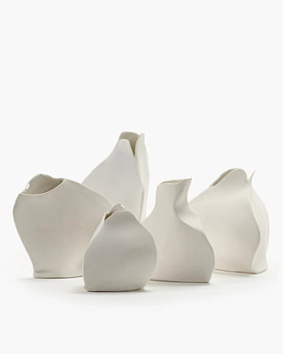 Deze kleine vazen, uitgevoerd in mat porselein zijn ontworpen door Roos van de Velde. De kleine vazen doen denken aan bloemblaadjes. Leuk om zo neer te zetten, maar ook heel erg leuk met één of enkele kleine bloemen erin.